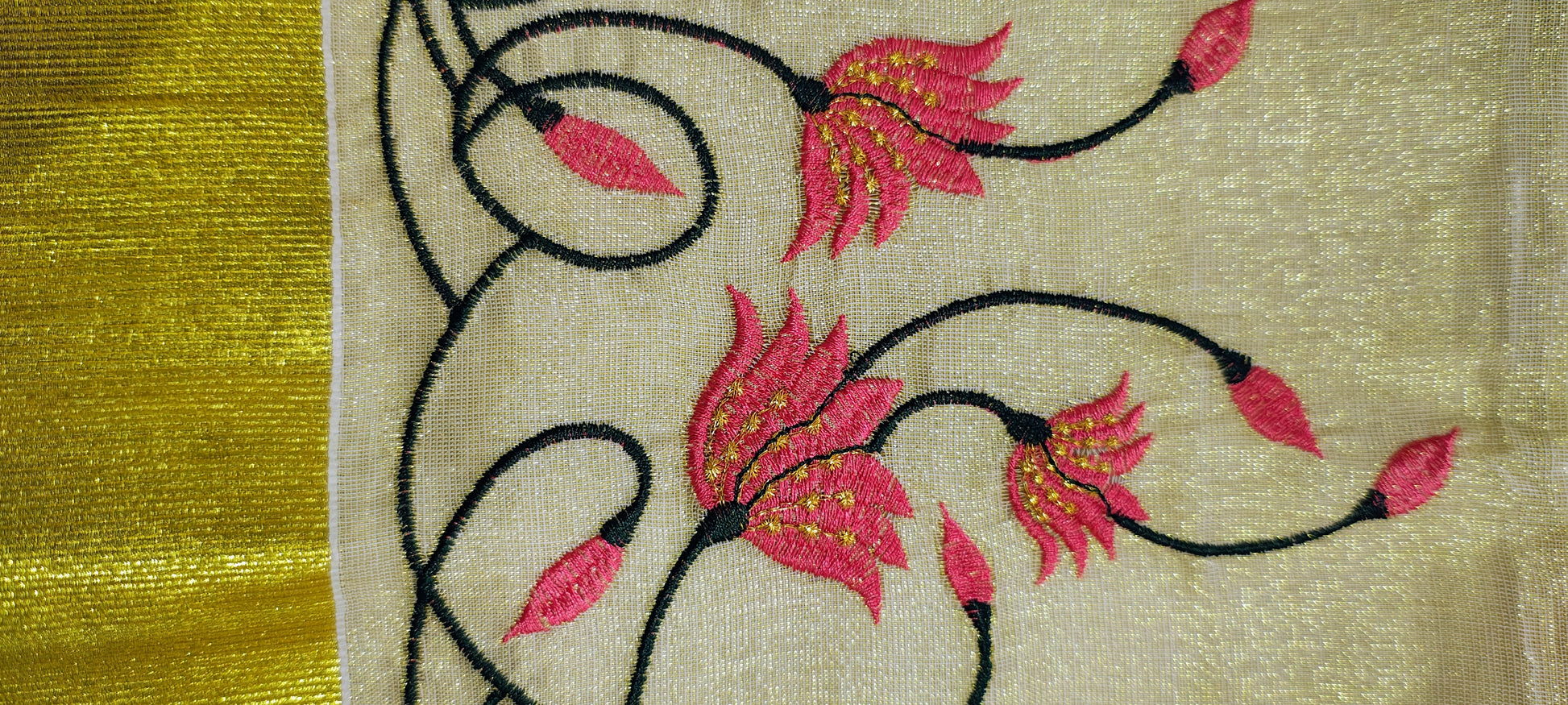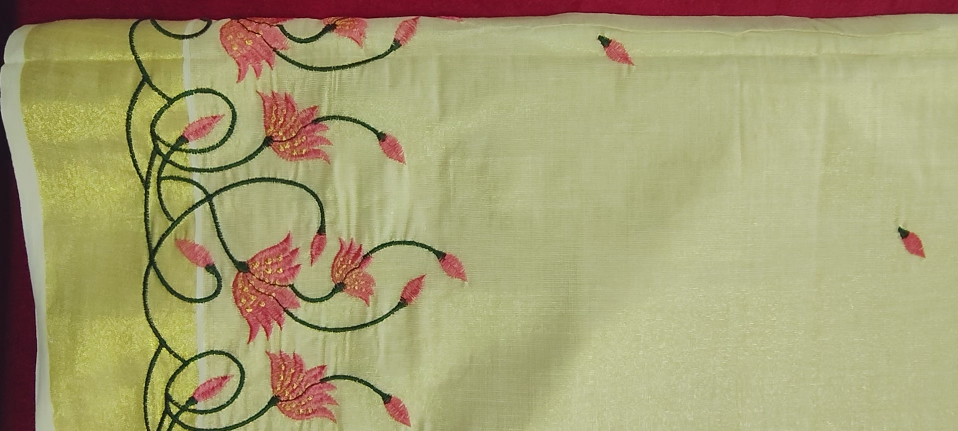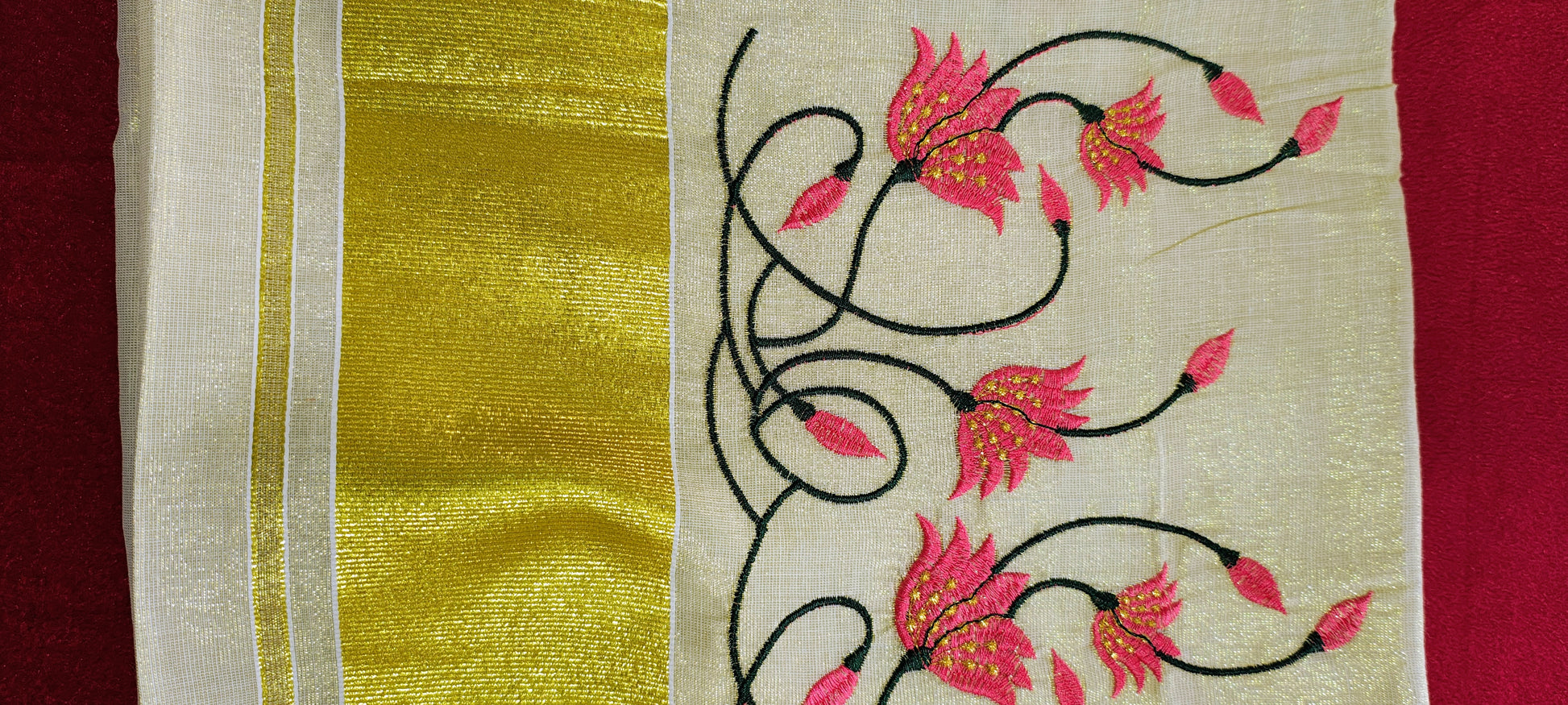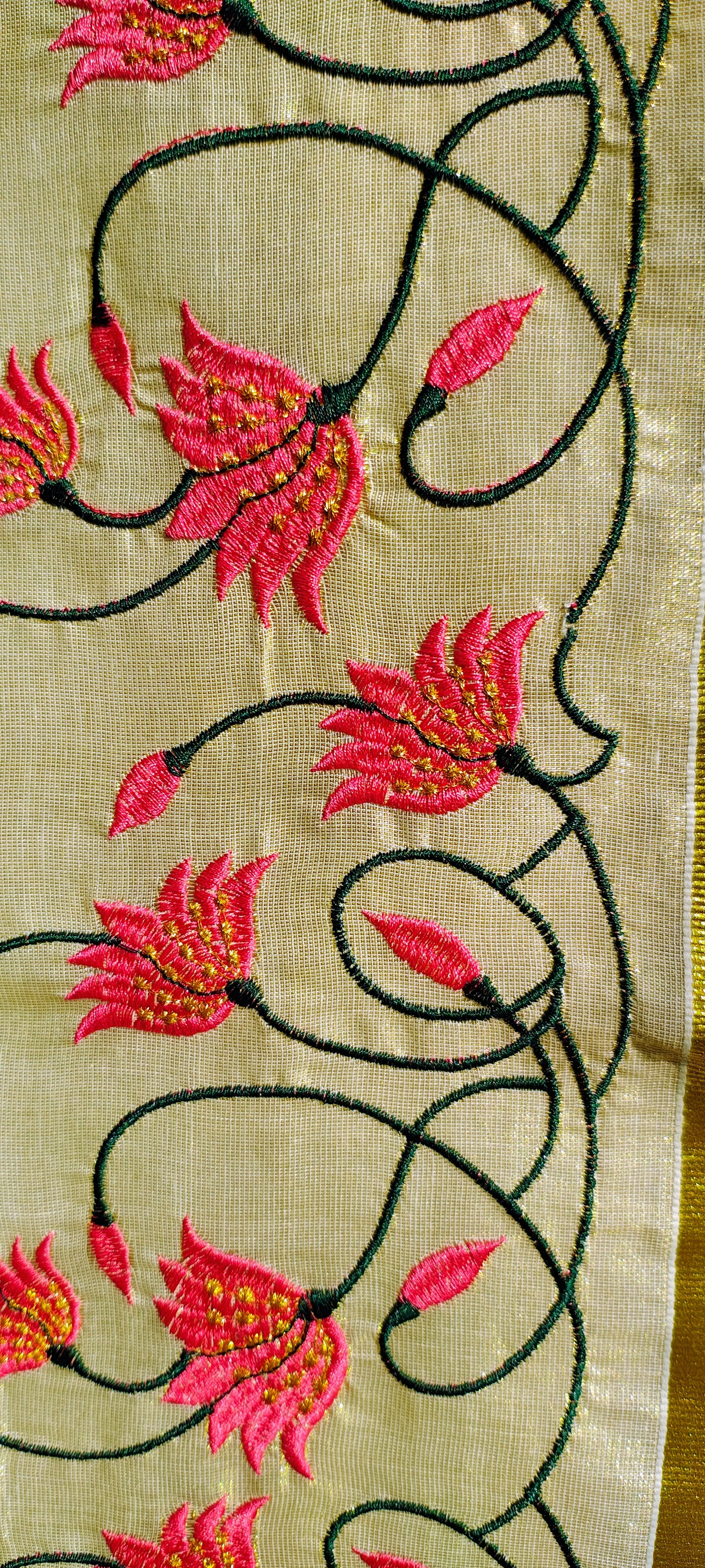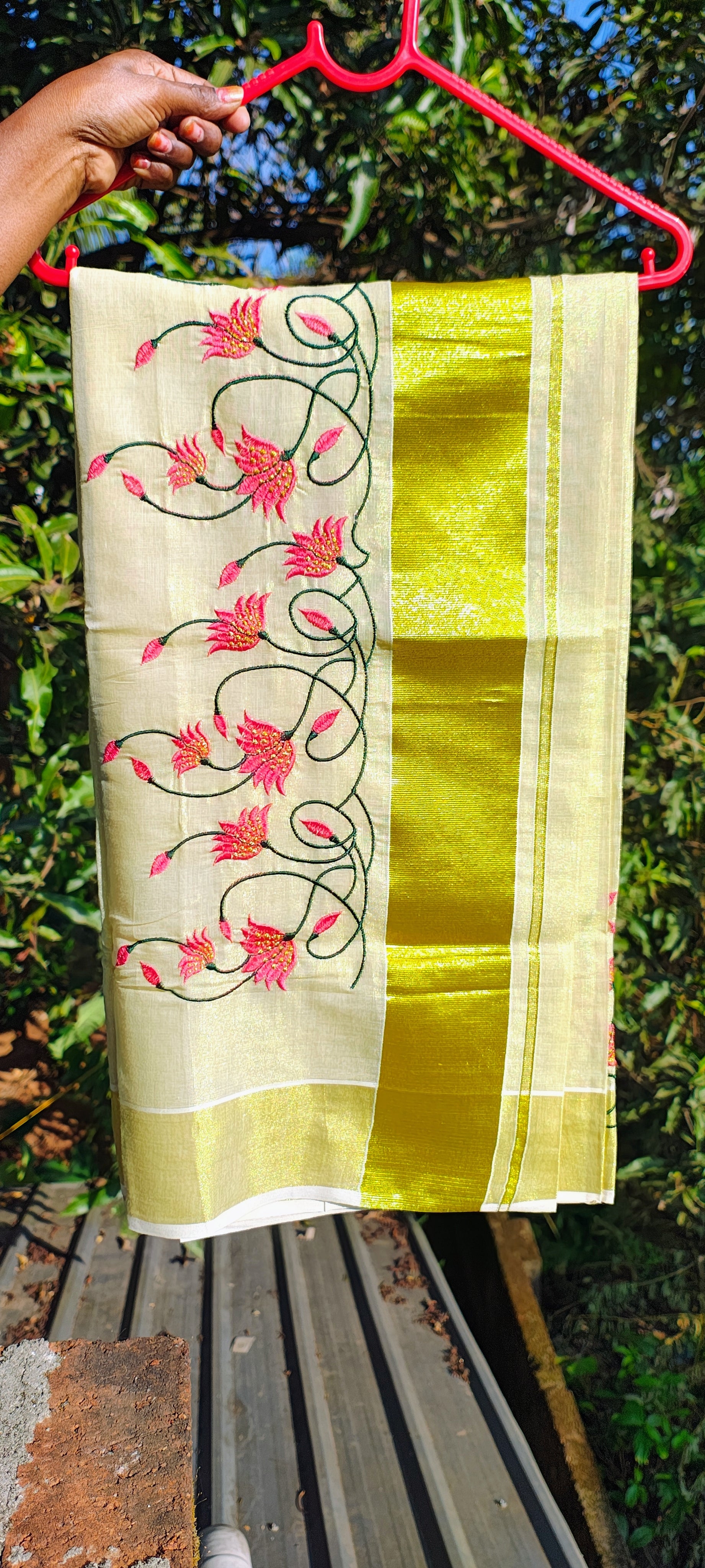 Tissue cotton Embroidery Pink Lotus Kerala Kuthampully Handloom 6.25 mtr